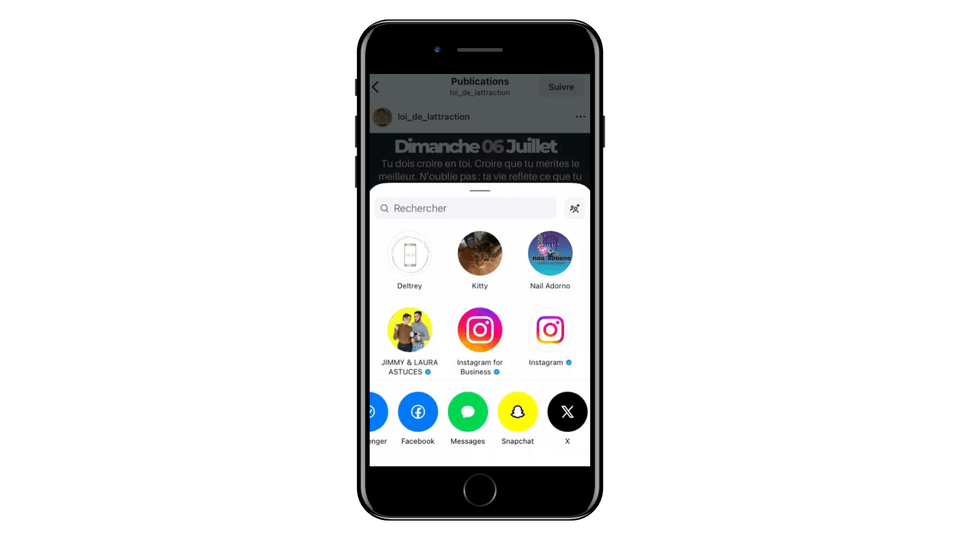 Pour partager une publication sur Instagram, sélectionnes le comptes destinataire ou recherche un utilisateur, puis partages là !