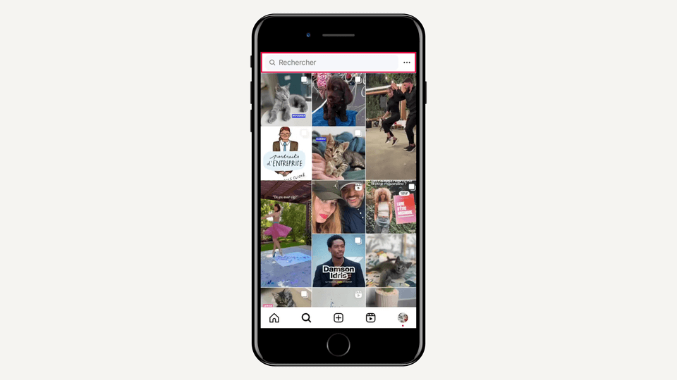 La page Explorer et recherche, qui est représentée par une petite loupe, permet de rechercher des comptes, des hashtags et des lieux.