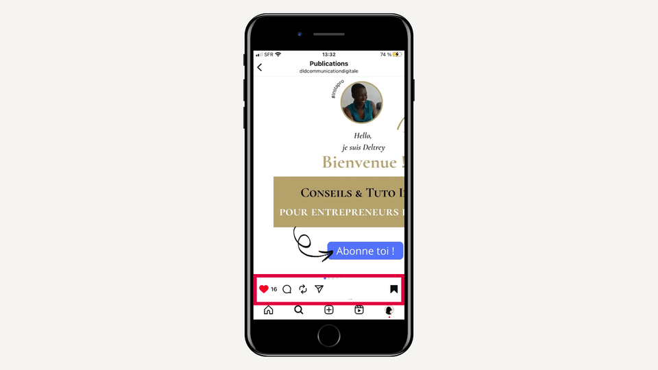 - Tu peux aimer une publication, en appuyant sur l’icône en forme de cœur