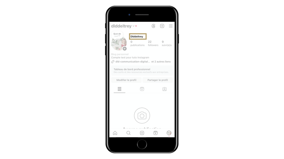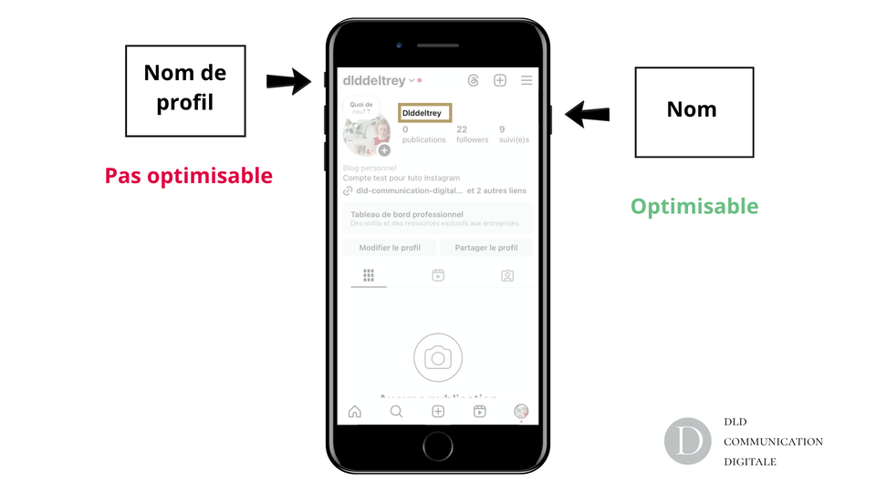Le nom est à ne pas confondre avec le nom de profil, qui est votre nom d’utilisateur Instagram et qui se trouve tout en haut à gauche (le nom de profil n’est pas optimisable, contrairement au nom).