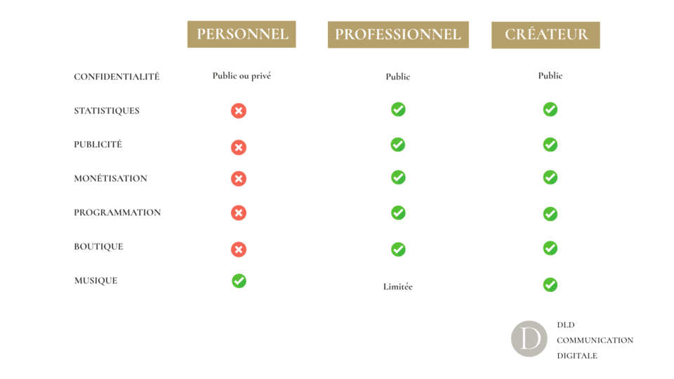 - Le profil professionnel, qui regroupe les comptes personnels et les comptes créateurs
