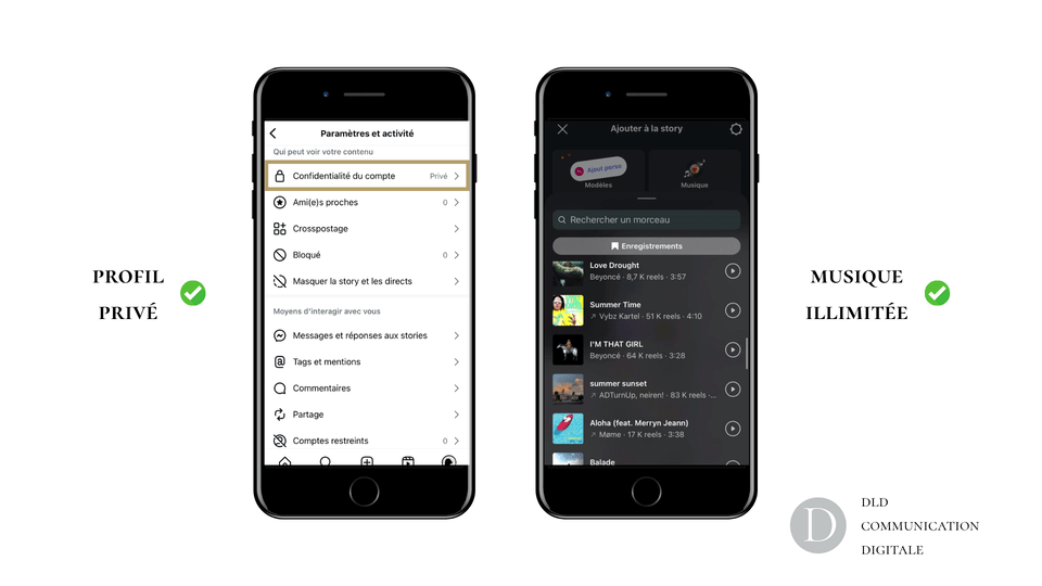 - Avoir accès à toutes les musiques disponibles sur Instagram (pour des questions de droits d’auteur)