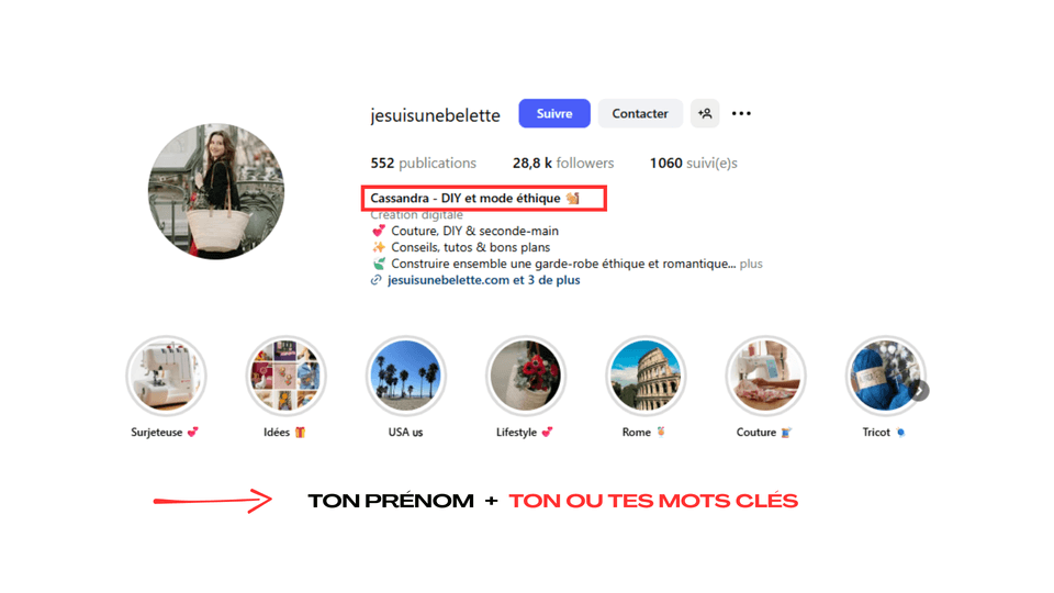 L’utilisation de mots clés dans votre nom, aide votre profil à être trouvé, car vous donnez aux algorithmes d’Instagram, plus d’infos sur qui vous êtes.