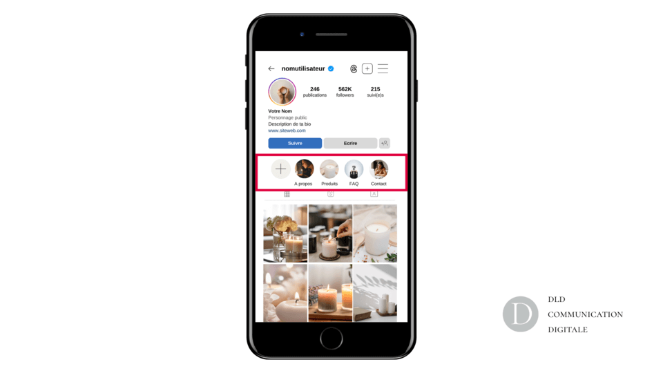 Vos stories à la une (aussi appelées highlights) doivent être optimisées de manière à ce qu’une personne qui visitent votre profil puisse avoir rapidement des informations sur vous, votre entreprise, vos créations (au cas où elle hésiterait encore à s’abonner à votre compte et qu’elle aimerait en savoir plus).
