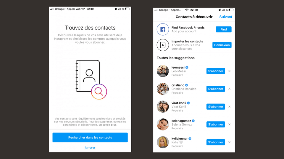 Une fois l’opération effectuée vous serez invité à rechercher à vous abonner à des comptes Instagram parmi vos contacts et parmi les comptes les plus populaires.