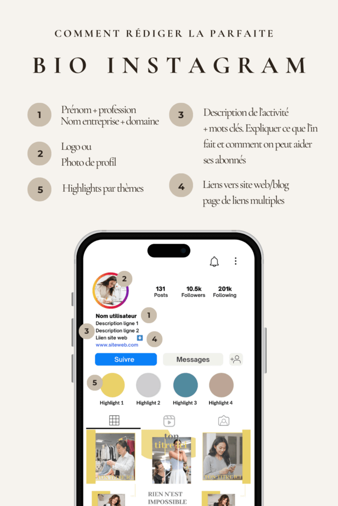 Voici une image qui vous indique comment faire pour bien optimiser votre bio Instagram :