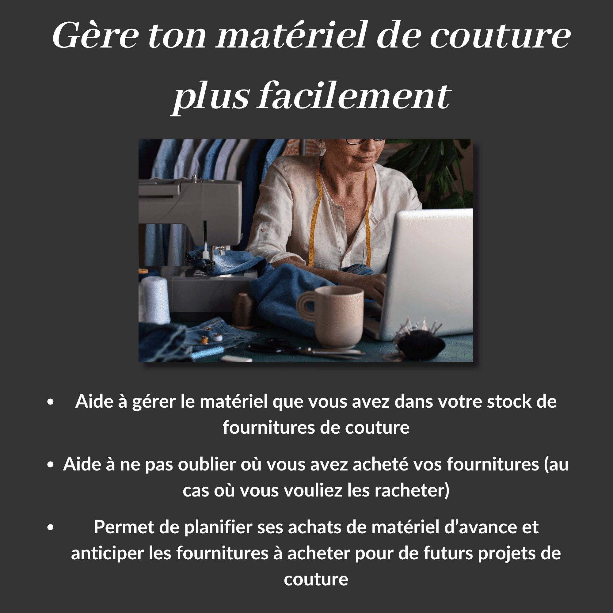 - Aide à gérer le matériel que vous avez dans votre stock de fournitures de couture
