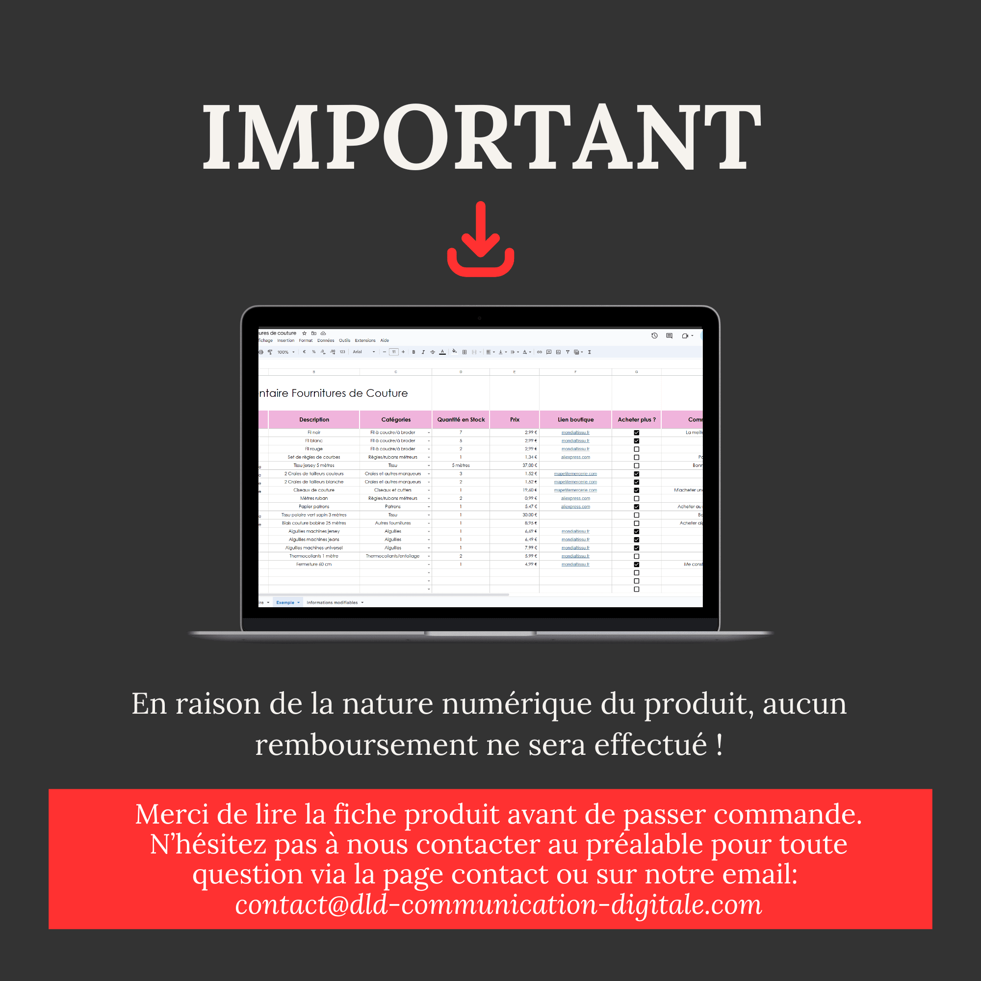 Ce tableau d’inventaire des fournitures de couture est la propriété exclusive de la société DLD Communication Digitale et est soumis au droit d’auteur.