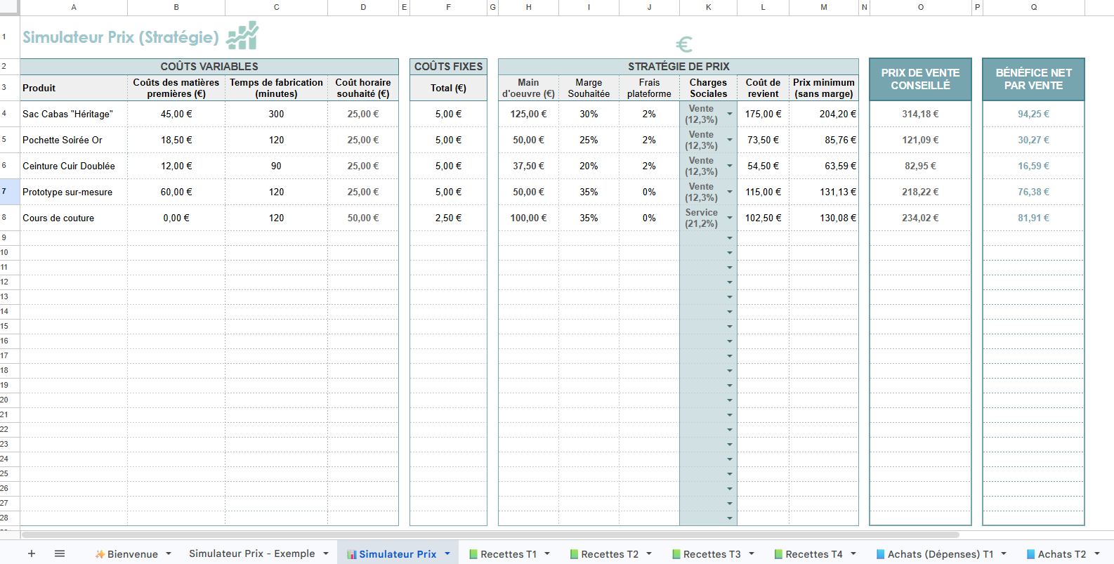 Le Simulateur de Prix « Zéro Oubli » : Calculez votre prix de vente en incluant enfin votre temps de main-d’œuvre, vos frais fixes et vos cotisations.